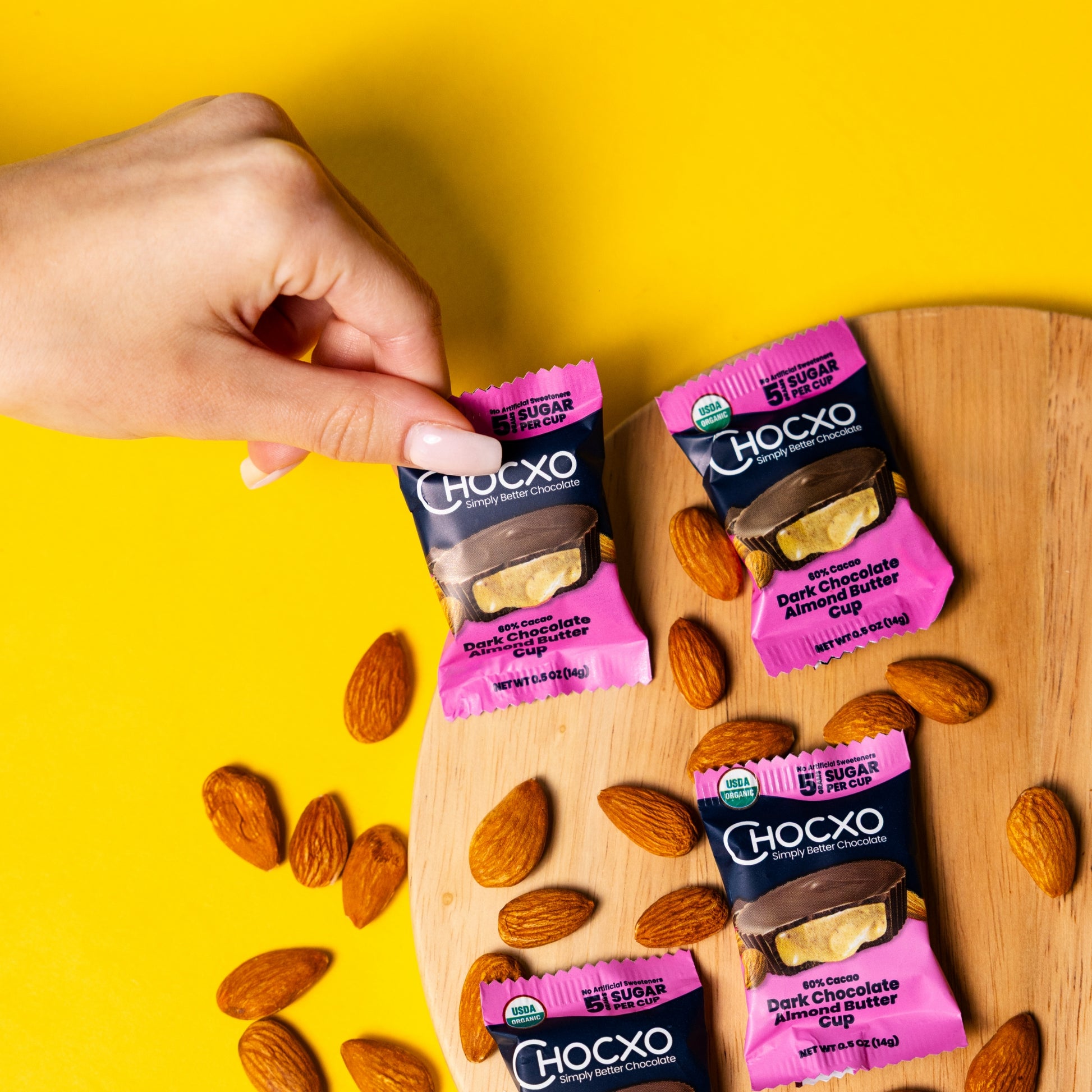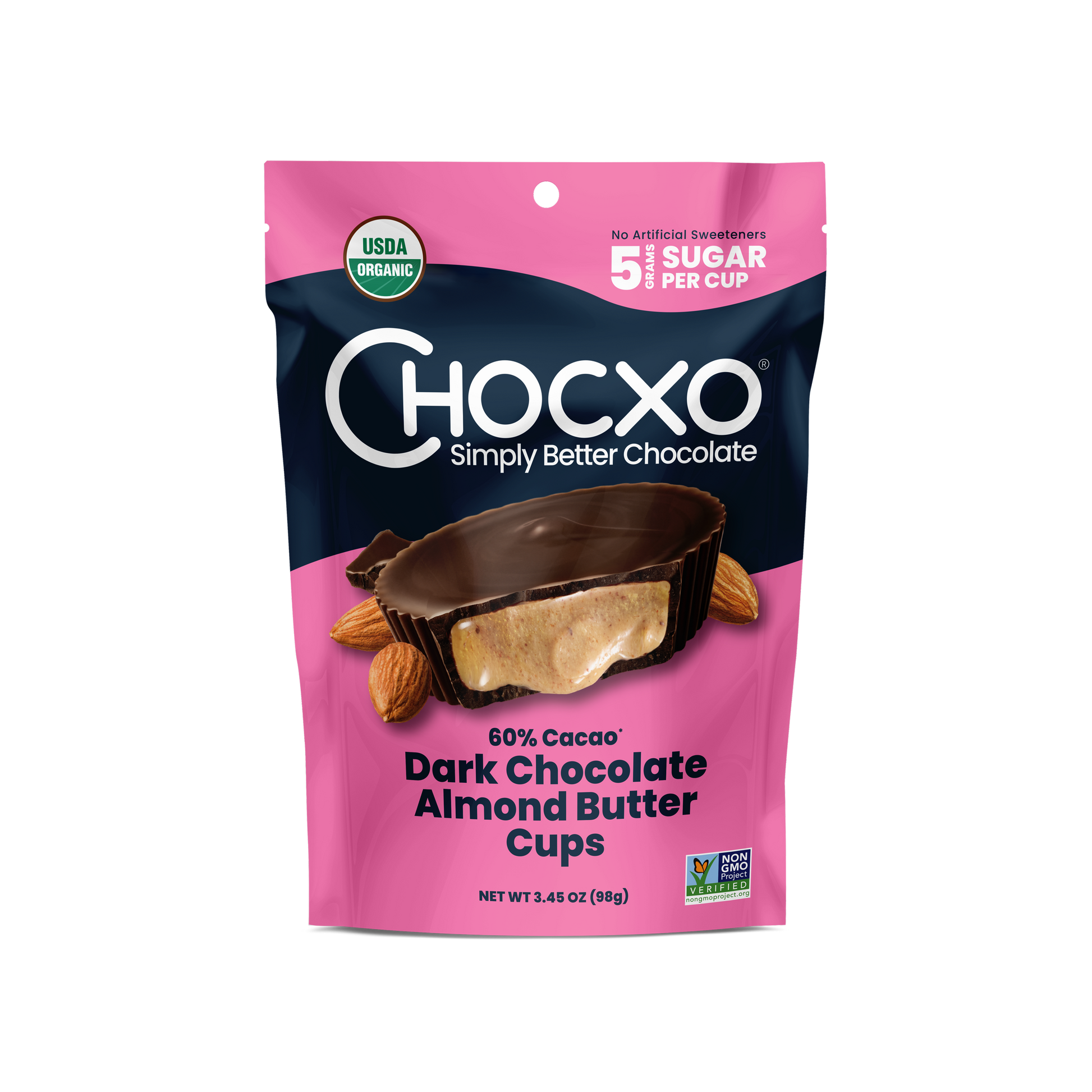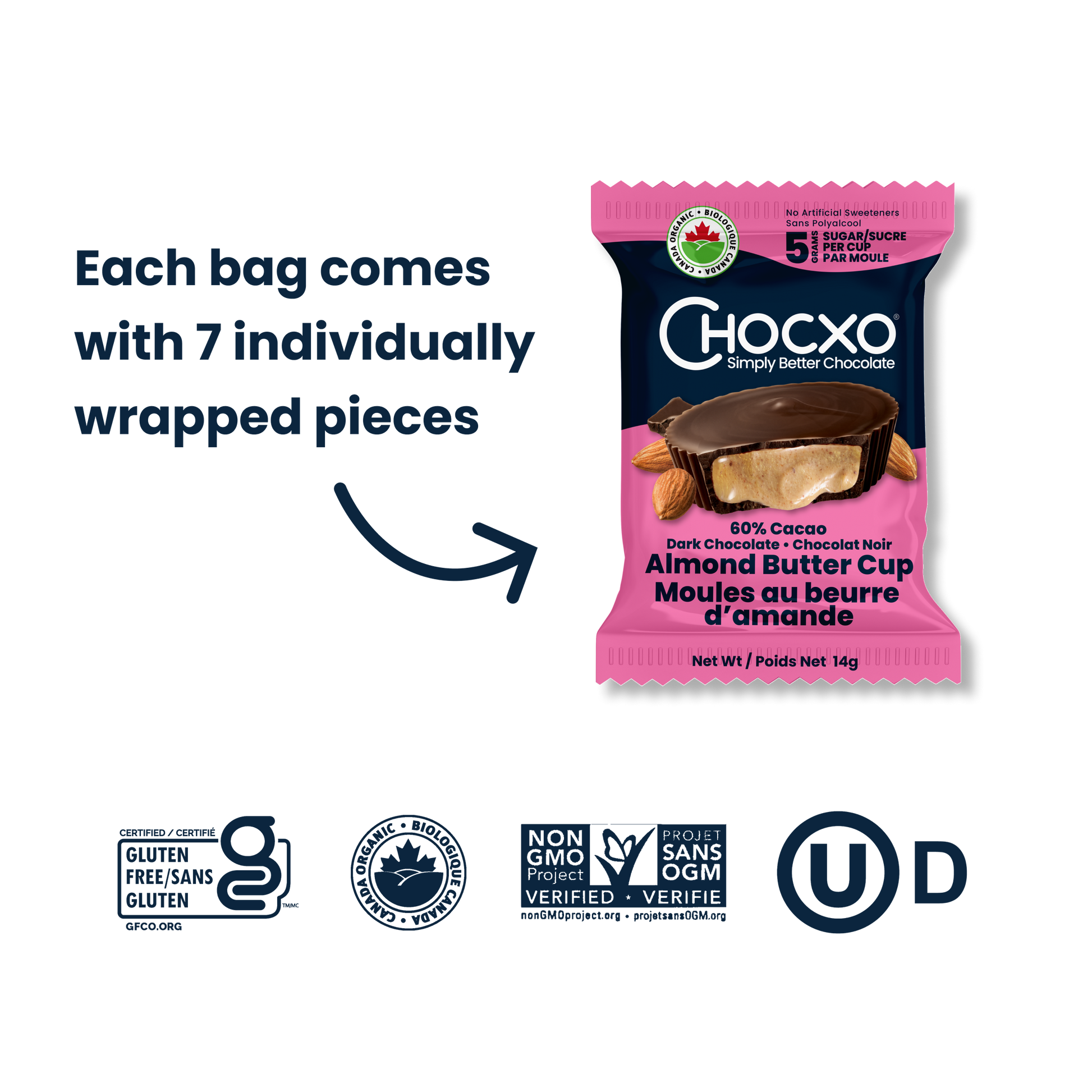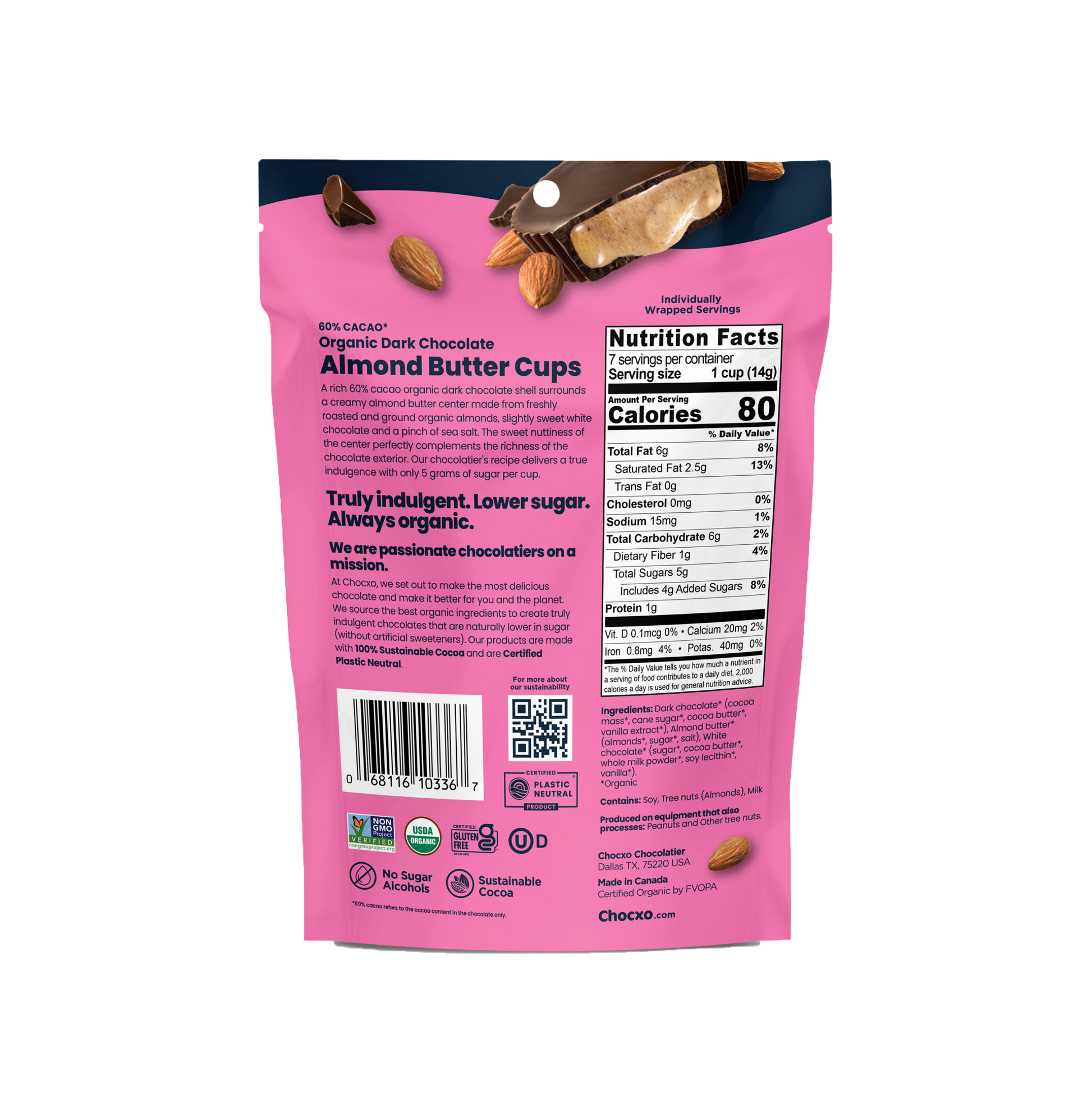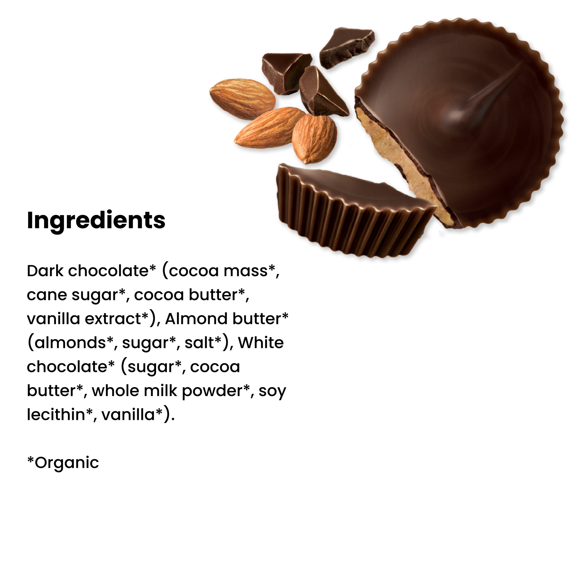 Indulge in snacking perfection with Dark Chocolate Almond Butter Cups. Fresh roasted and ground organic almonds combine with white chocolate and a touch of real organic cane sugar for a melt-in-your mouth center enrobed in a 60% dark chocolate shell. The best part? Only 5 grams of sugar for a whole lot of indulgence.