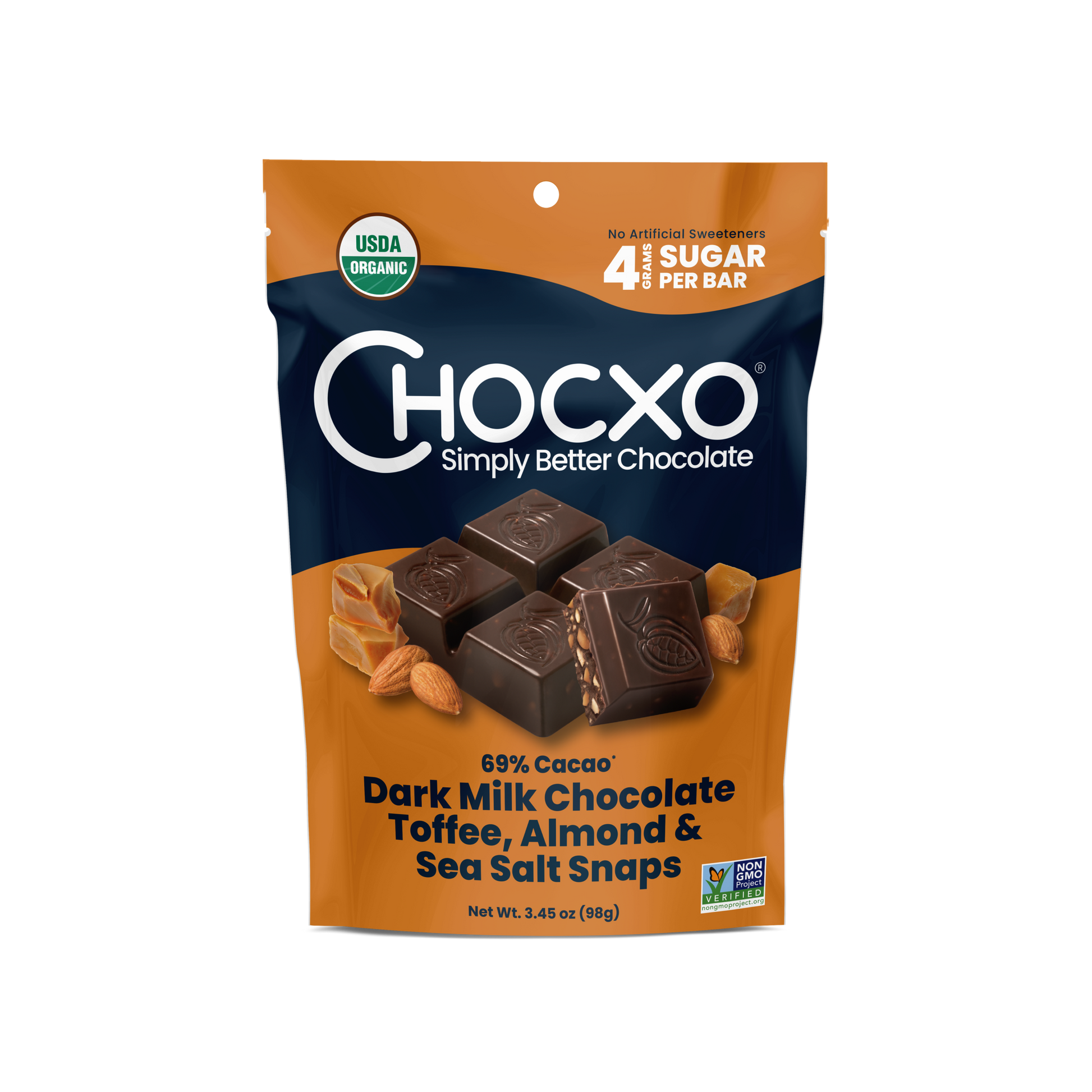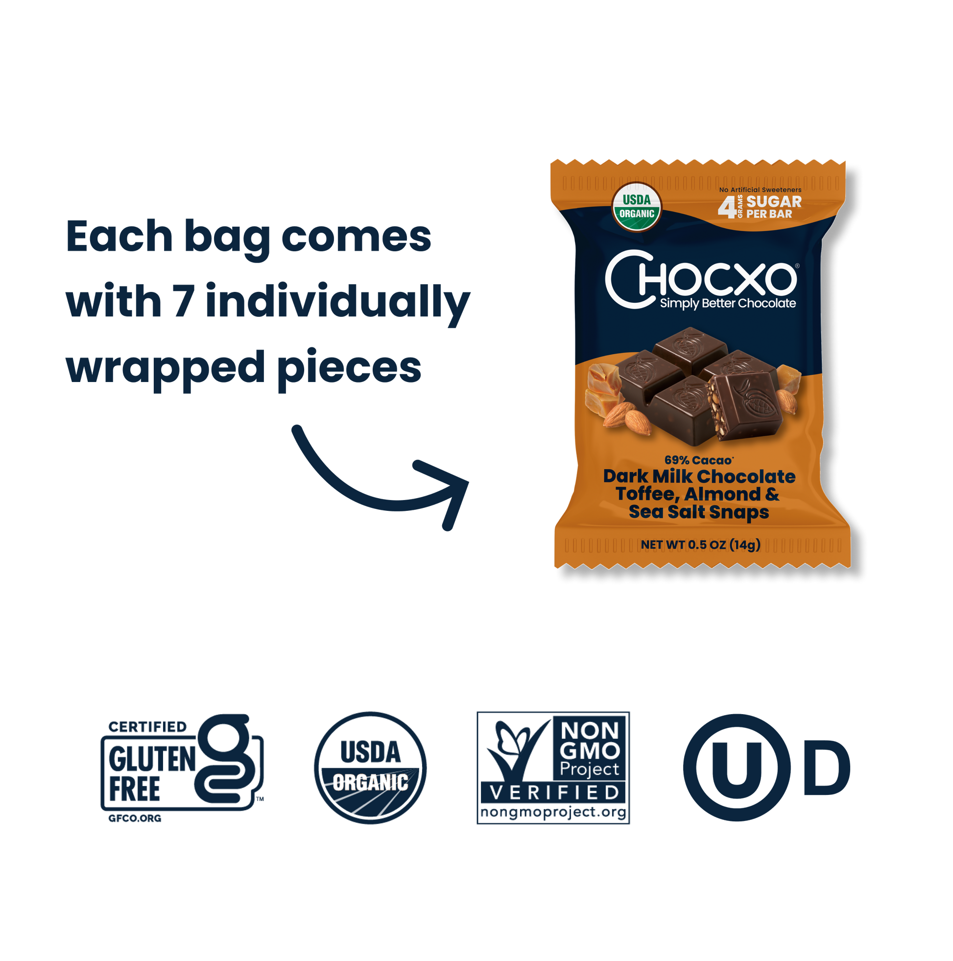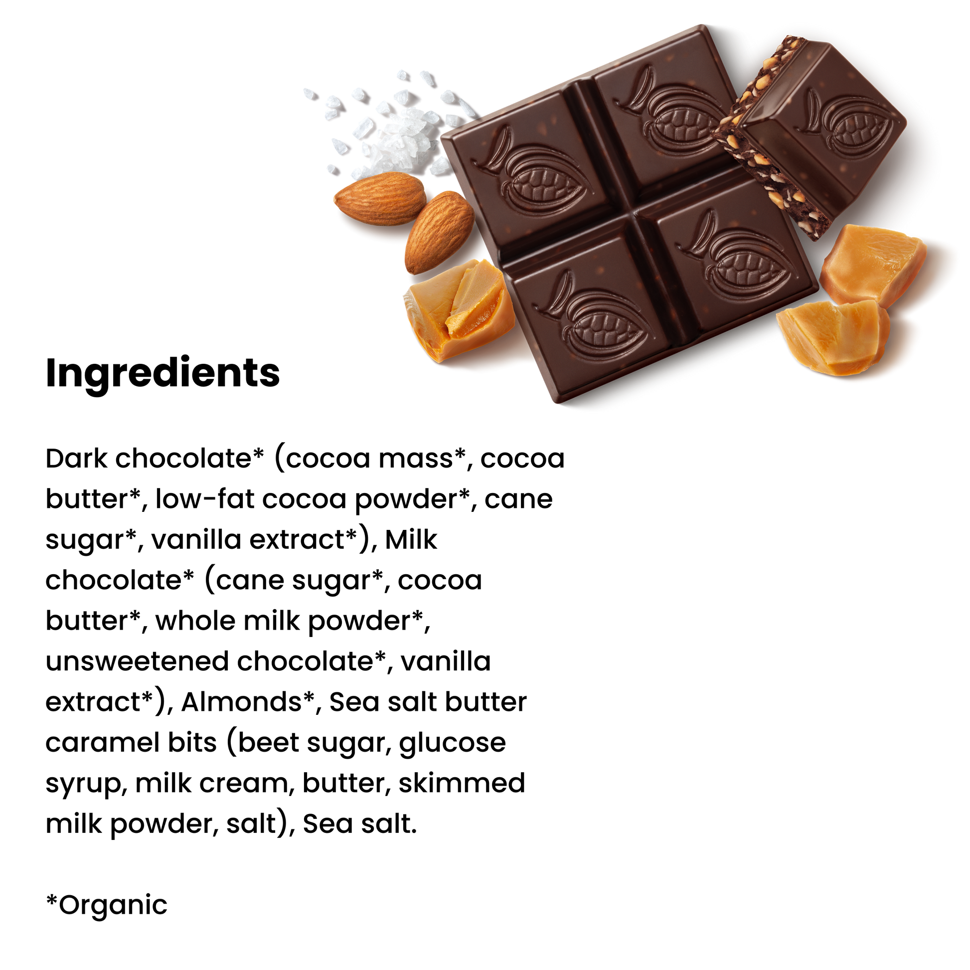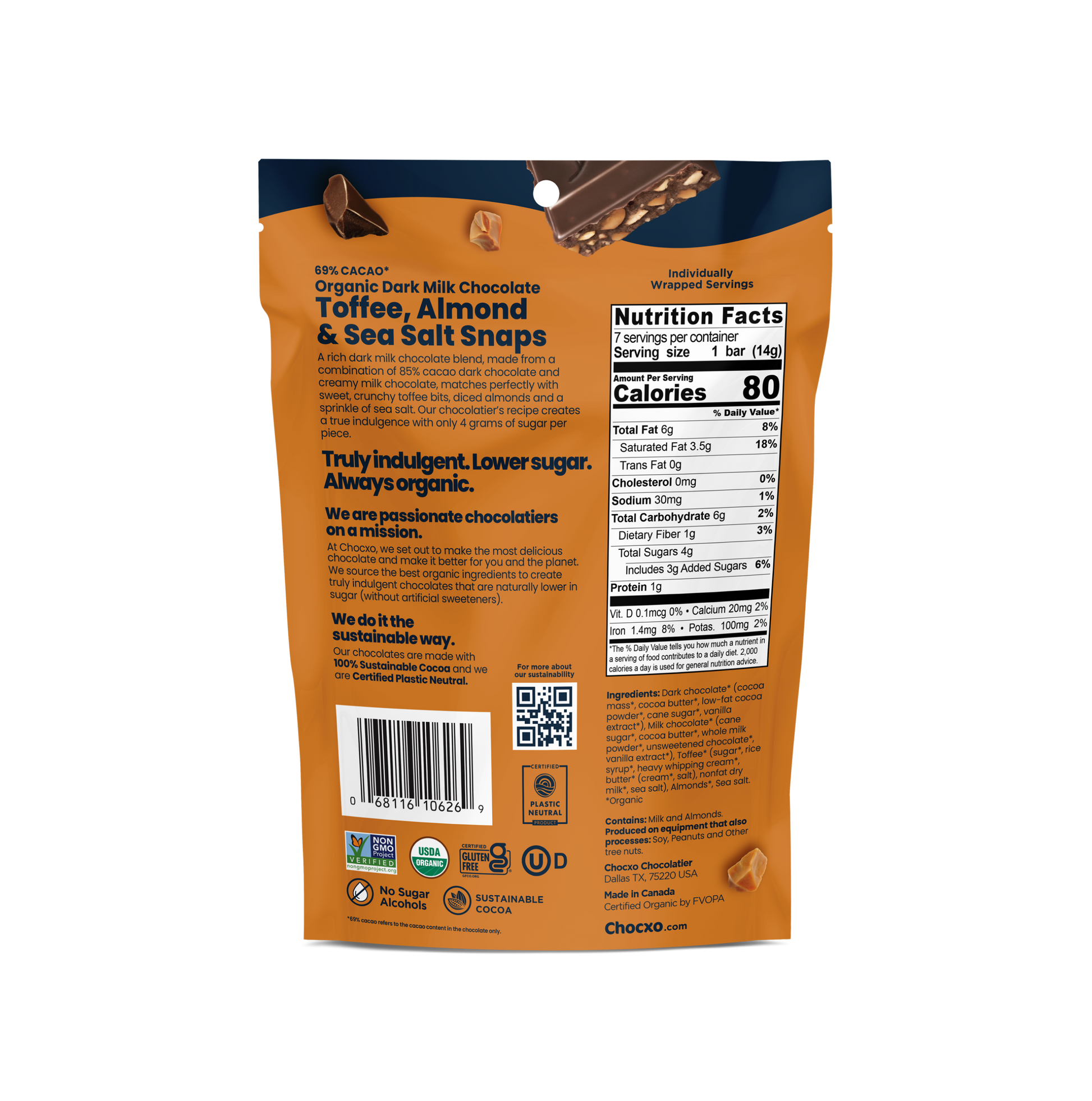 A rich dark milk chocolate blend, made from a combination of 85% cacao dark chocolate and creamy milk chocolate, matches perfectly with a sweet, crunchy toffee bits, diced almonds and a sprinkle of sea salt. Our chocolatiers recipe creates a true indulgence with only 4 grams of sugar per piece.